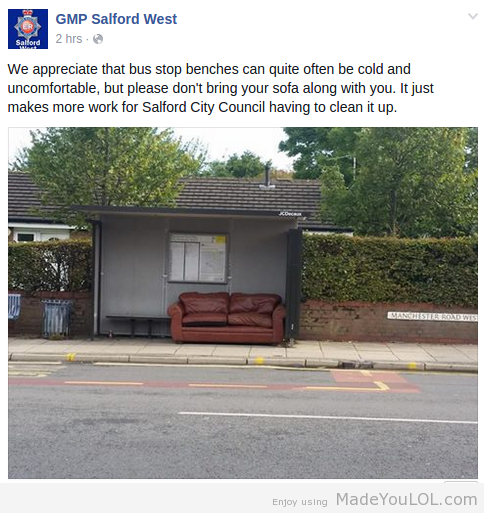 It looks like someone doesn’t like the usual cold; uncomfortable and usually wet benches you find at bus stops. They appear to taken it upon themselves to replace them with the latest bus stop benches, a nice comfy leather sofa. However, the guys at GMP Salford West don’t approve and posted the following on their facebook page.