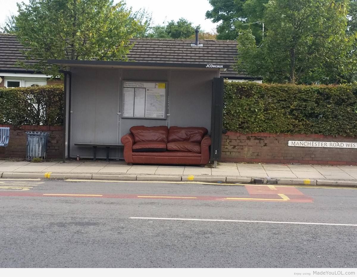 It looks like someone doesn’t like the usual cold; uncomfortable and usually wet benches you find at bus stops. They appear to taken it upon themselves to replace them with the latest bus stop benches, a nice comfy leather sofa. However, the guys at GMP Salford West don’t approve and posted the following on their facebook page.